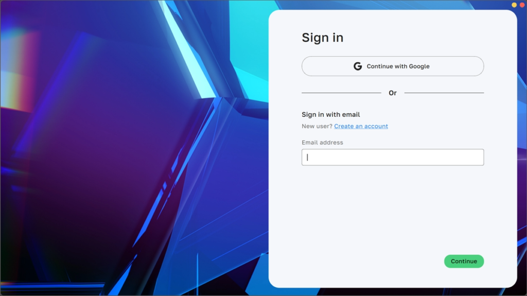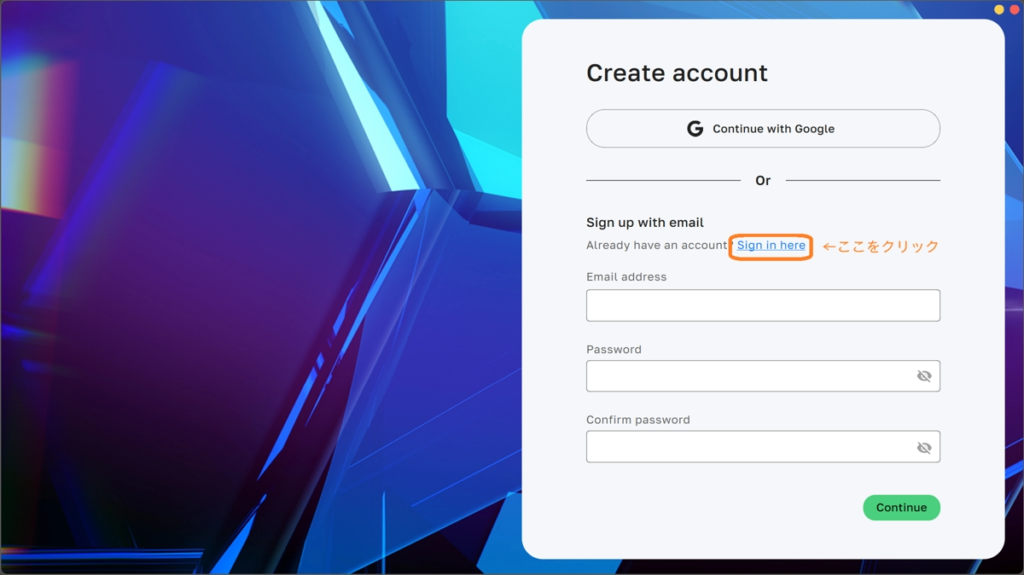 Boris FXに登録したメールアドレスを入力し、「Continue」をクリック。