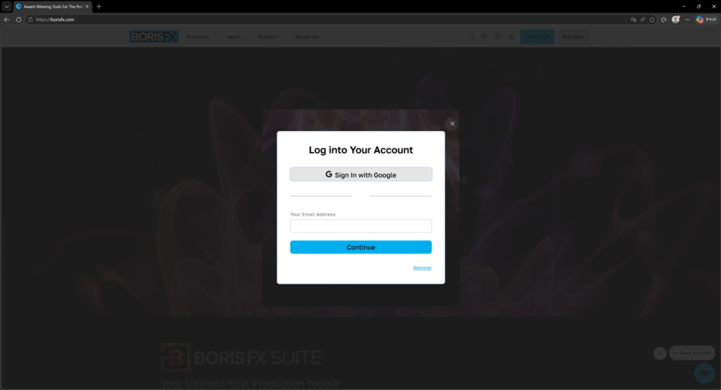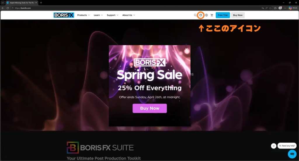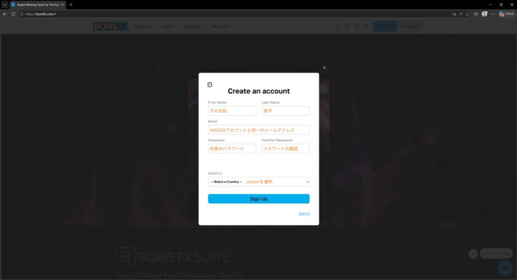Boris FXのサイトにアクセスし、画面右上にあるアイコンからアカウント作成画面へ進みます。