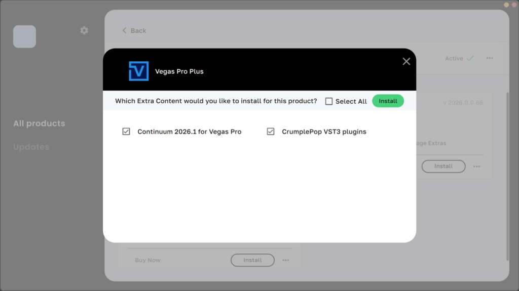 Boris FX Hub上で「Vegas Pro Plus」を選択し、「Install」をクリックします。