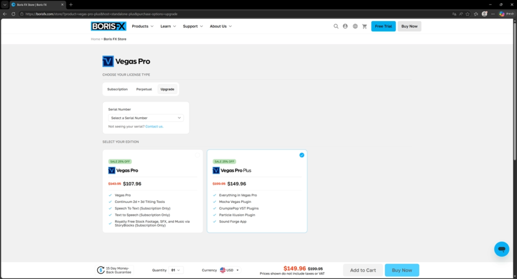 Vegas Pro Plusのアップグレード価格は、定価の199.95ドルではなく、25%オフの149.96ドルになっていました。