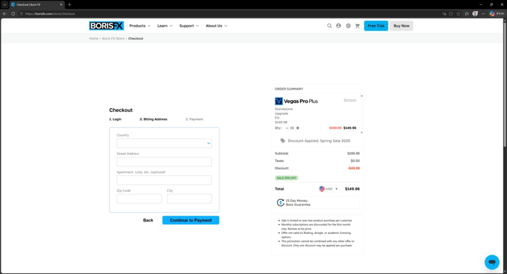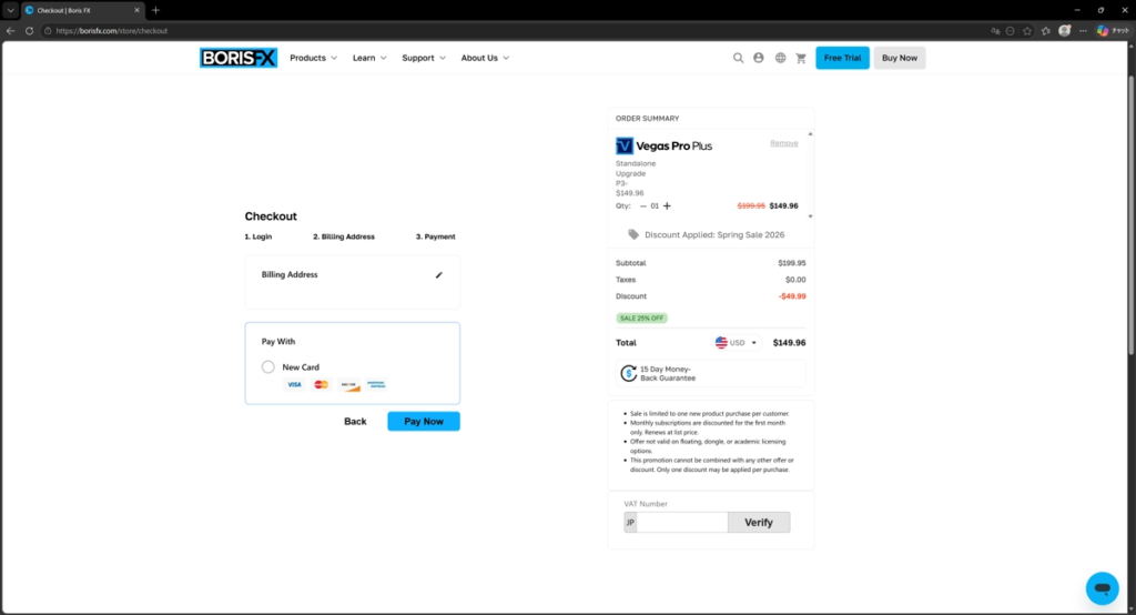 私が購入した時点(2026.4.24)では、Boris FXのSpring Saleにより25%オフで購入できました。ただし、キャンペーン期間や終了時刻(2026.4.26 Midnight)は変更される可能性があります。また、海外サイトのため日本時間とは異なる可能性があります。購入前に公式サイトの表示を必ず確認してください。