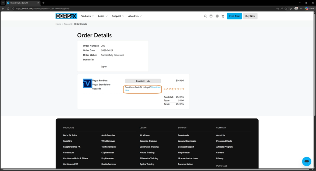 注文完了画面から「Boris FX Hub」をダウンロードします。