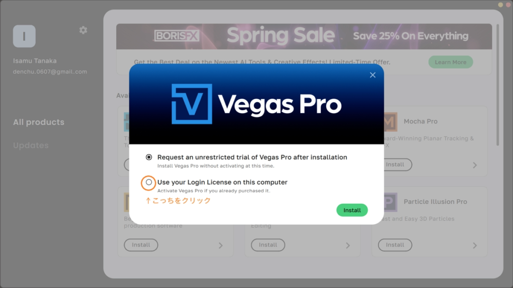 今回は、Boris FX版のVegas Pro 2026にアップグレードしたいので、Vegas Proの項目にある「Upgrade」ボタンをクリックしました。